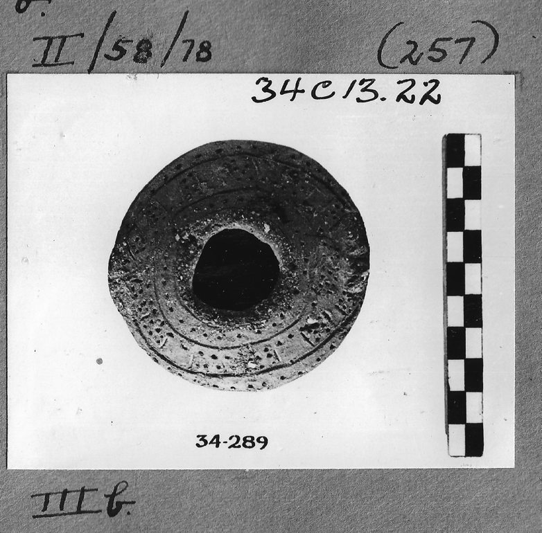 This terracotta whorl from Troy III is decorated with three circle band incisions around the surface with punched dots.