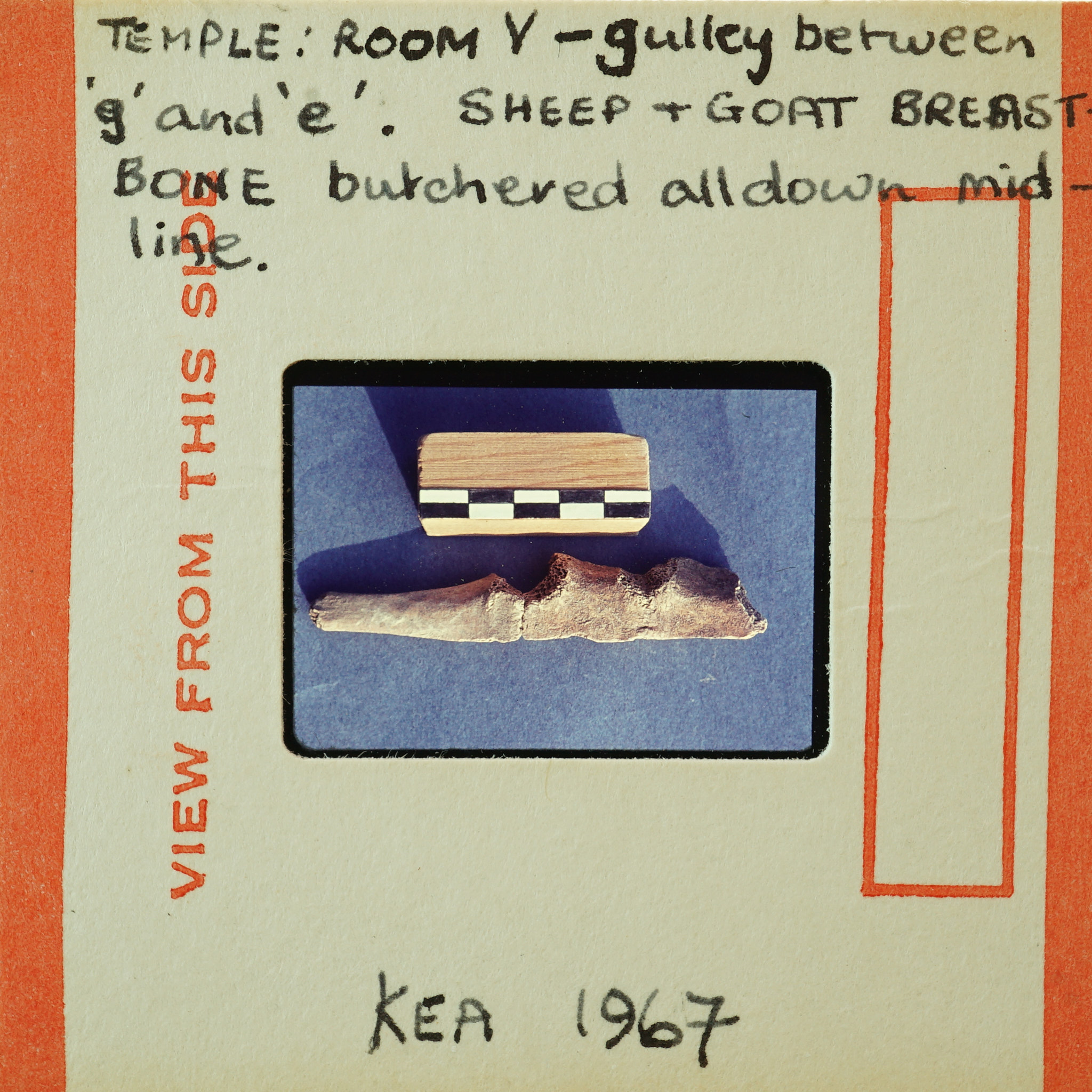 - Frame inscribed: Temple: Room V - gulley between g and e. Sheep + Goat breast bone butchered all down mid line Kea 1967.