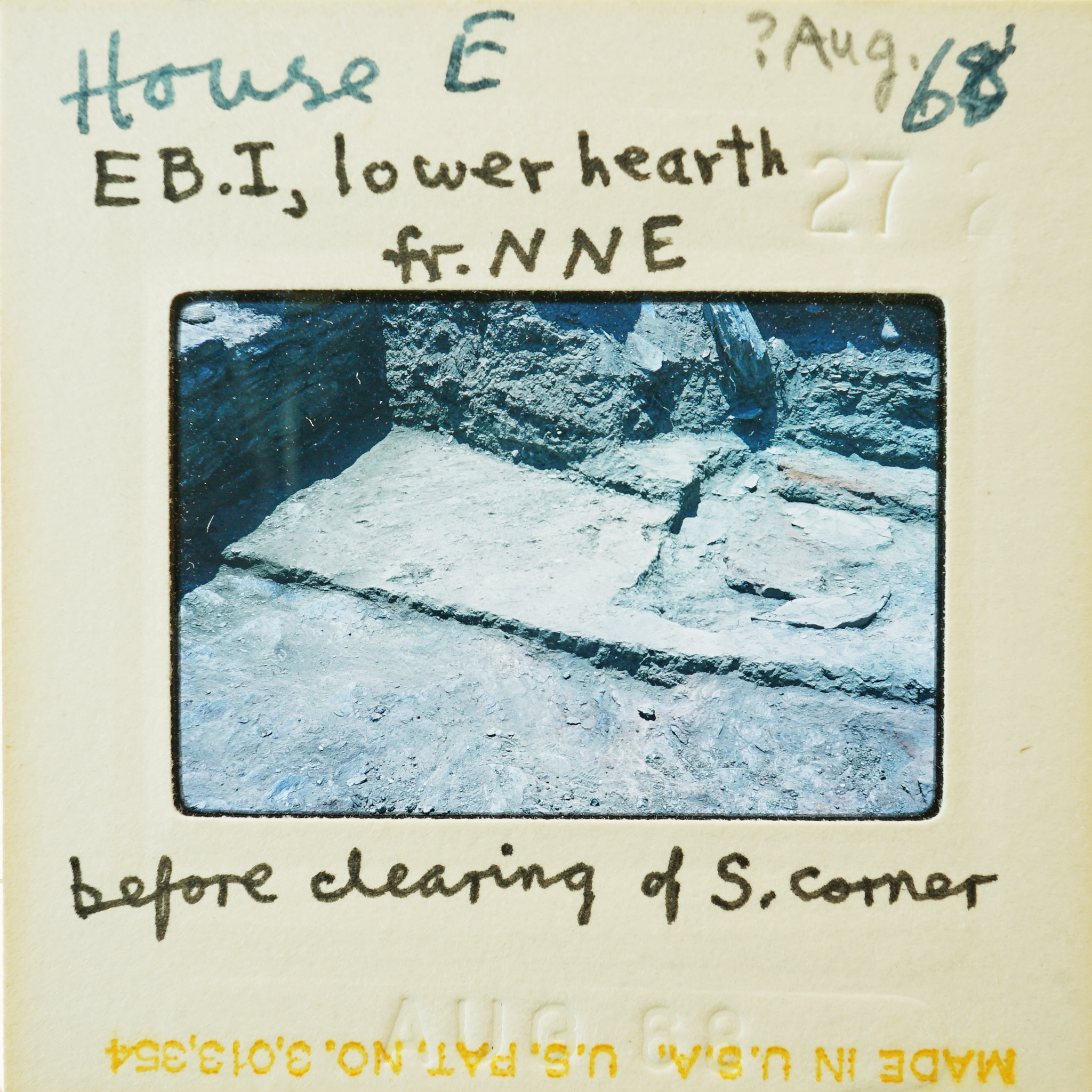 - Frame inscribed: House E EB.I, lower hearth fr. NNE ?Aug. 68 before cleaning of S. corner.