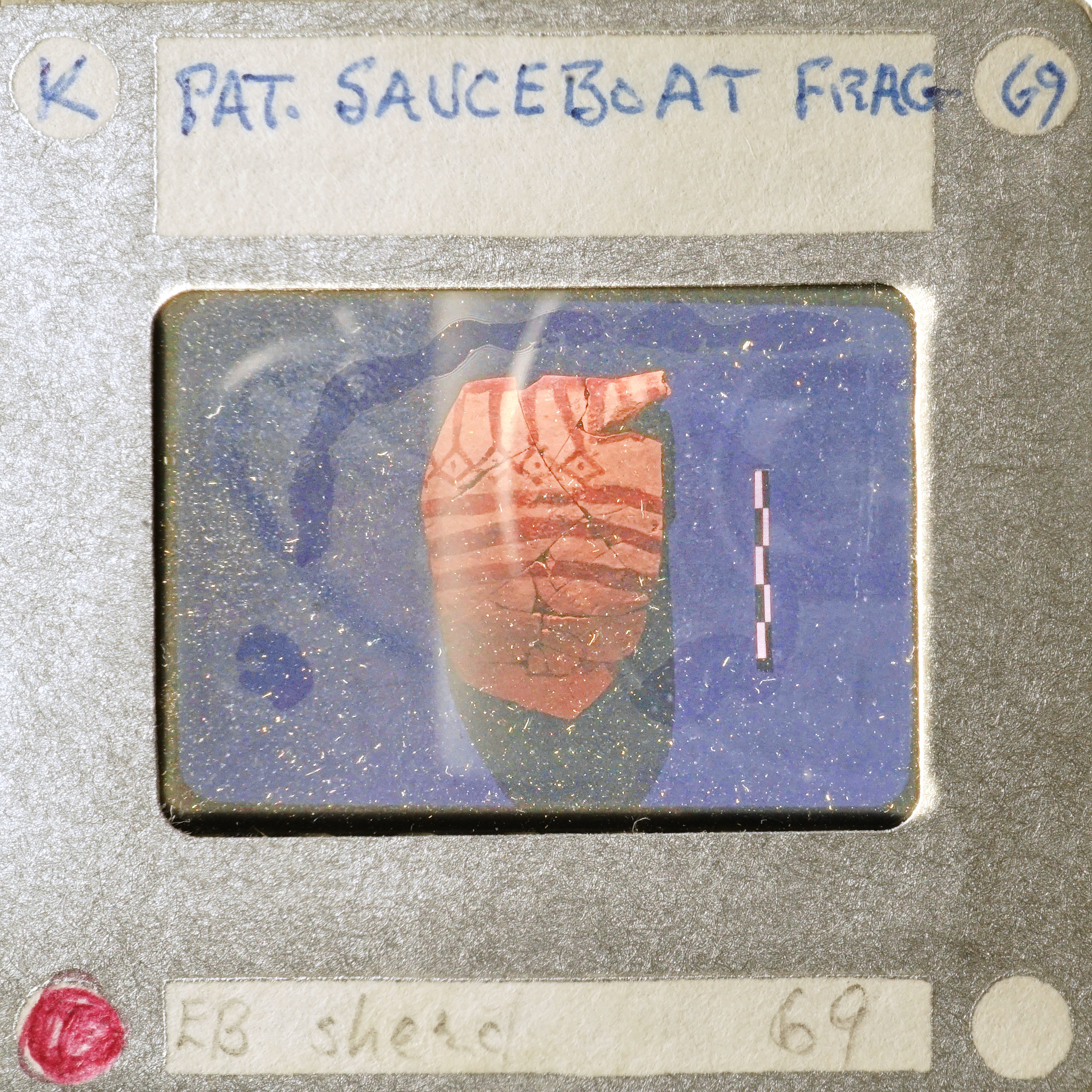 - Frame inscribed: Pat. Sauceboat Frag 69 K. 69 EB sherd.