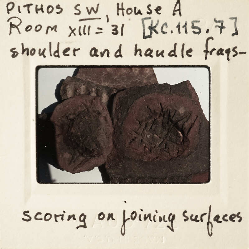 Frame inscribed: Pithos SW, House A room XIII=31 [KC.115.7] shoulder and handle frags- scoring on joining surfaces.