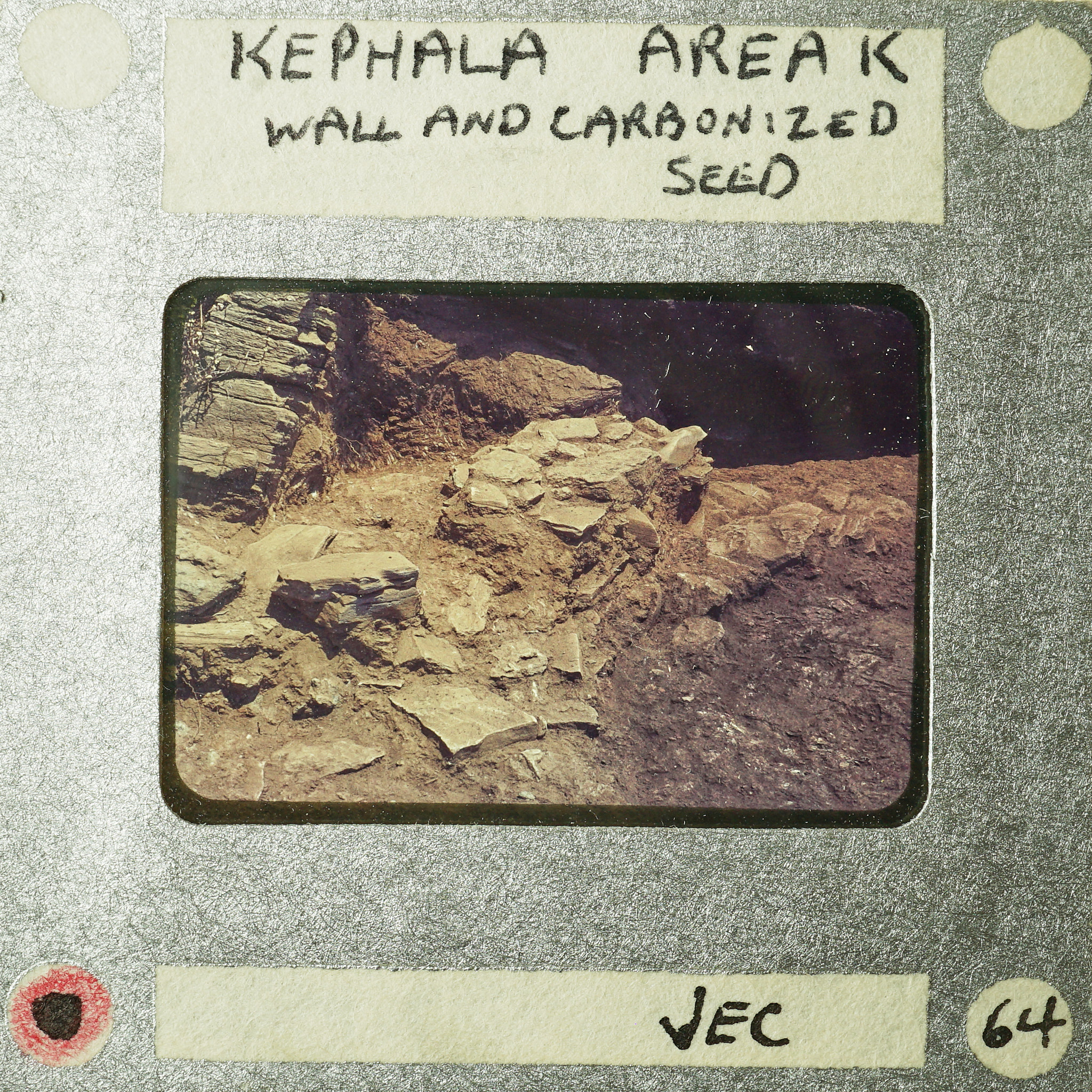 - Frame inscribed: Kephala Area K Wall and Carbonized Seed JEC 64.