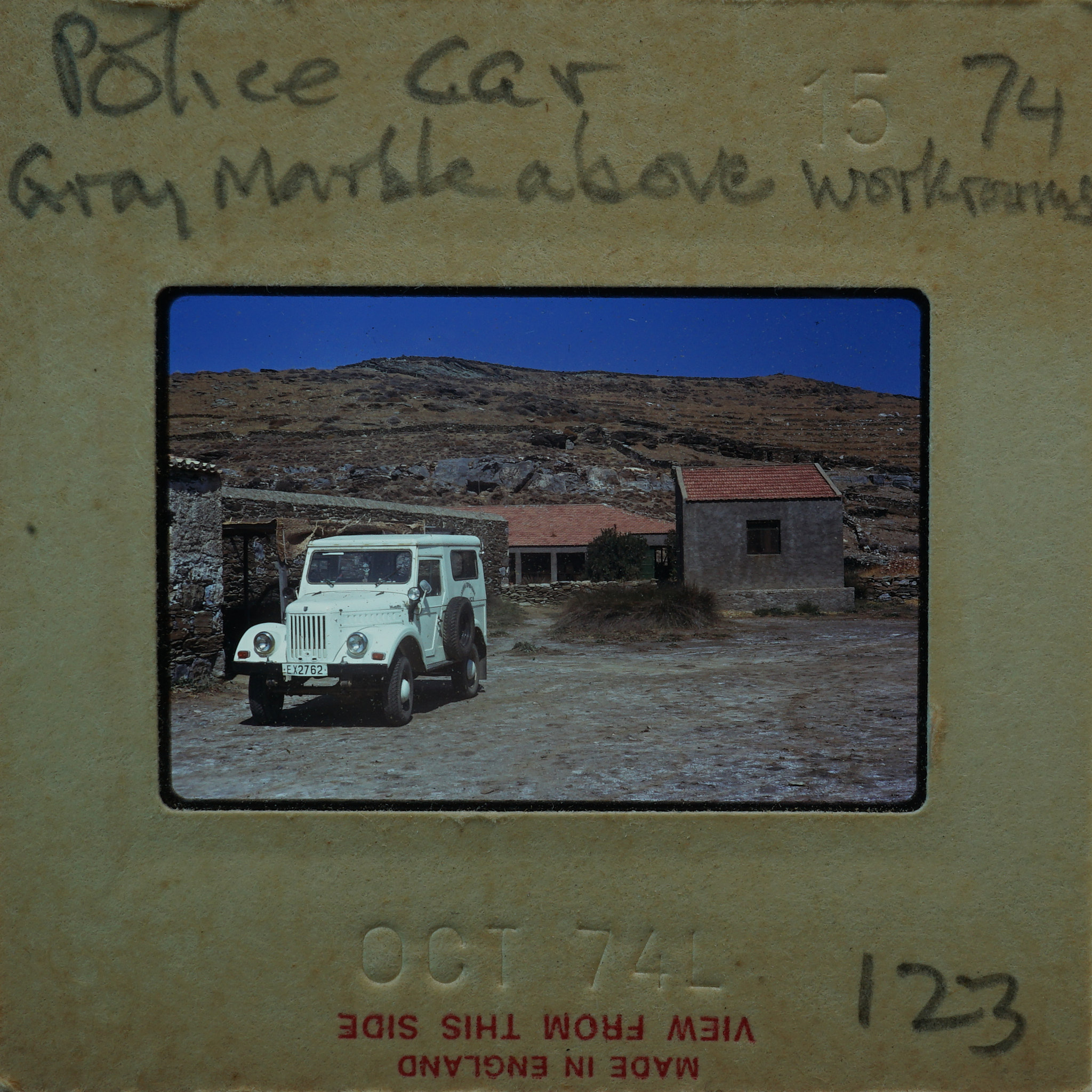 - Frame inscribed: Police Car, Gray marble above workroom 123.