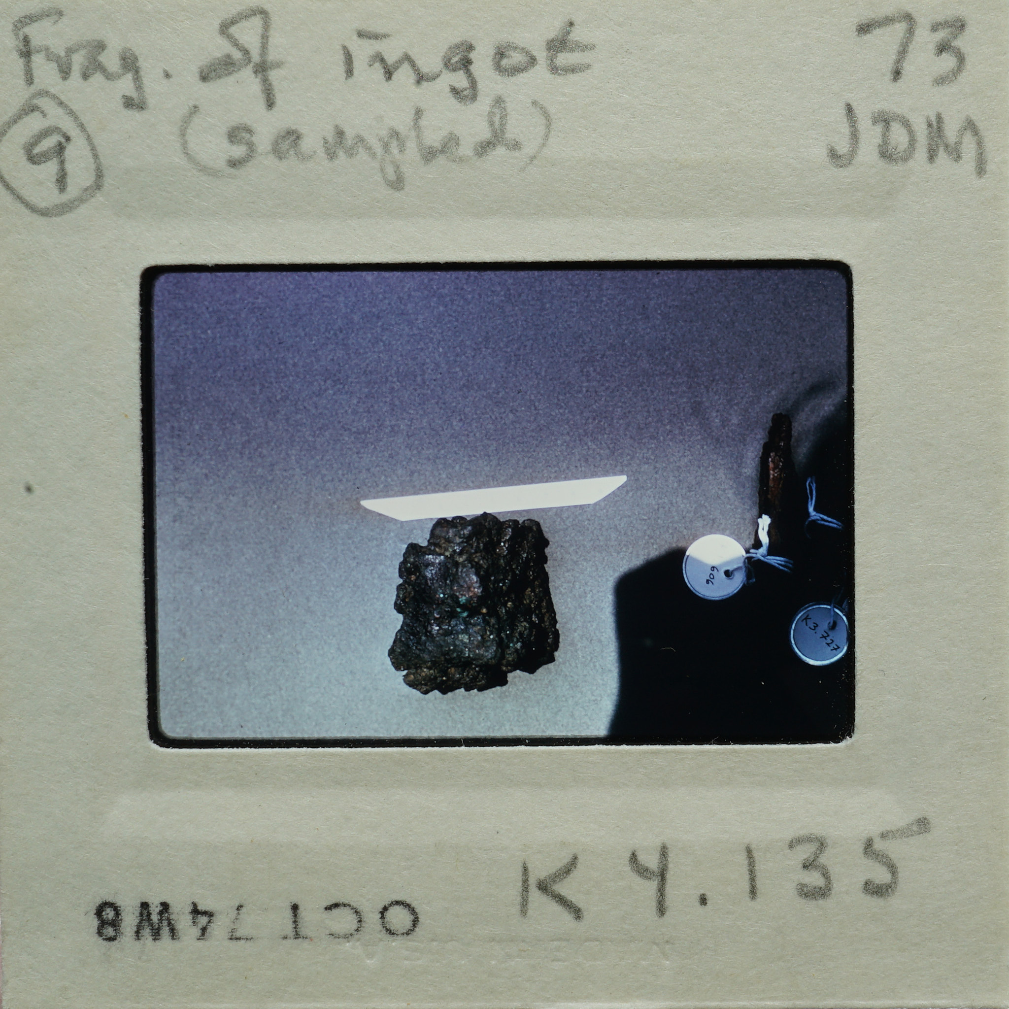 - Frame inscribed: Frag. of ingot (sampled) 9 K4.135 73 JDM.
