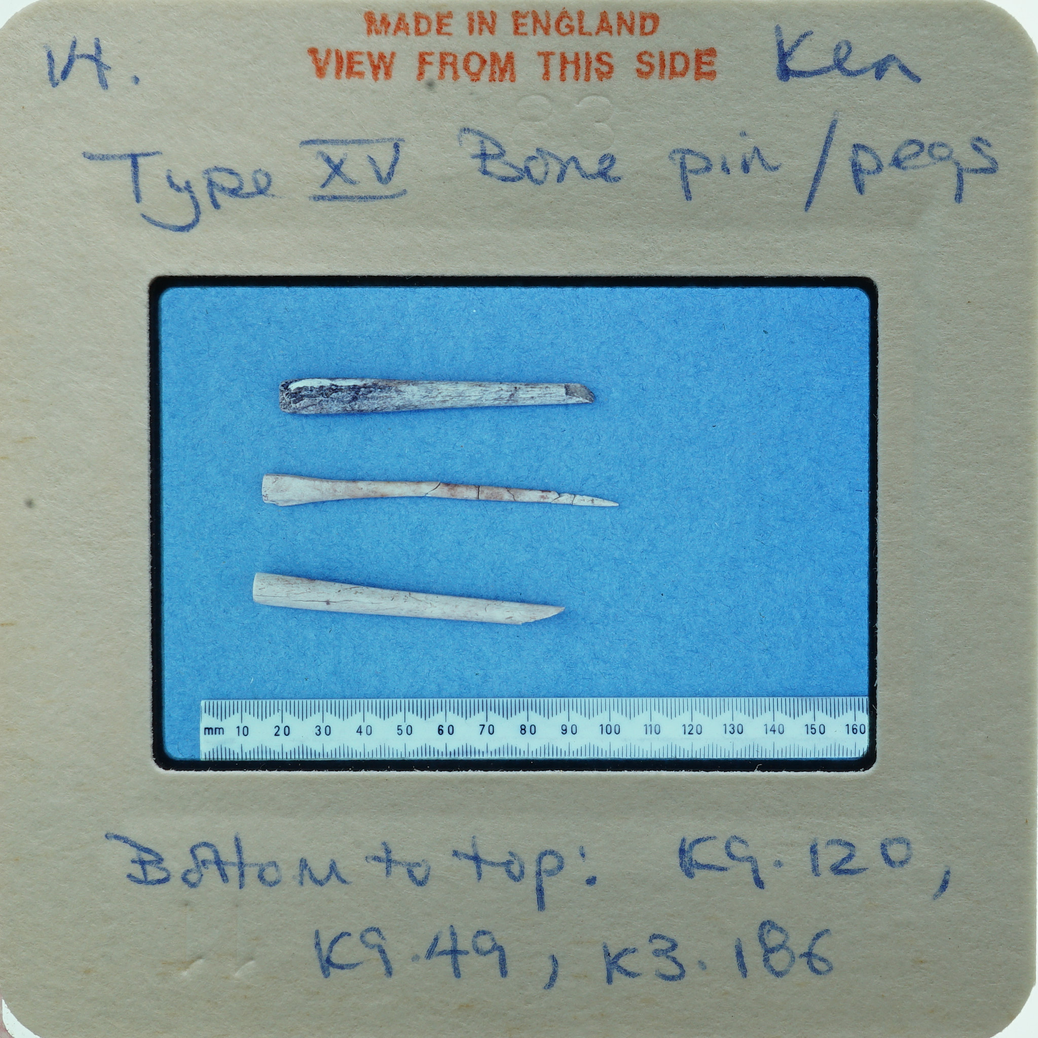 - Frame inscribed: Type XV bone pin/pegs Kea bottom to top: K4.120, K9.49, K3.186.