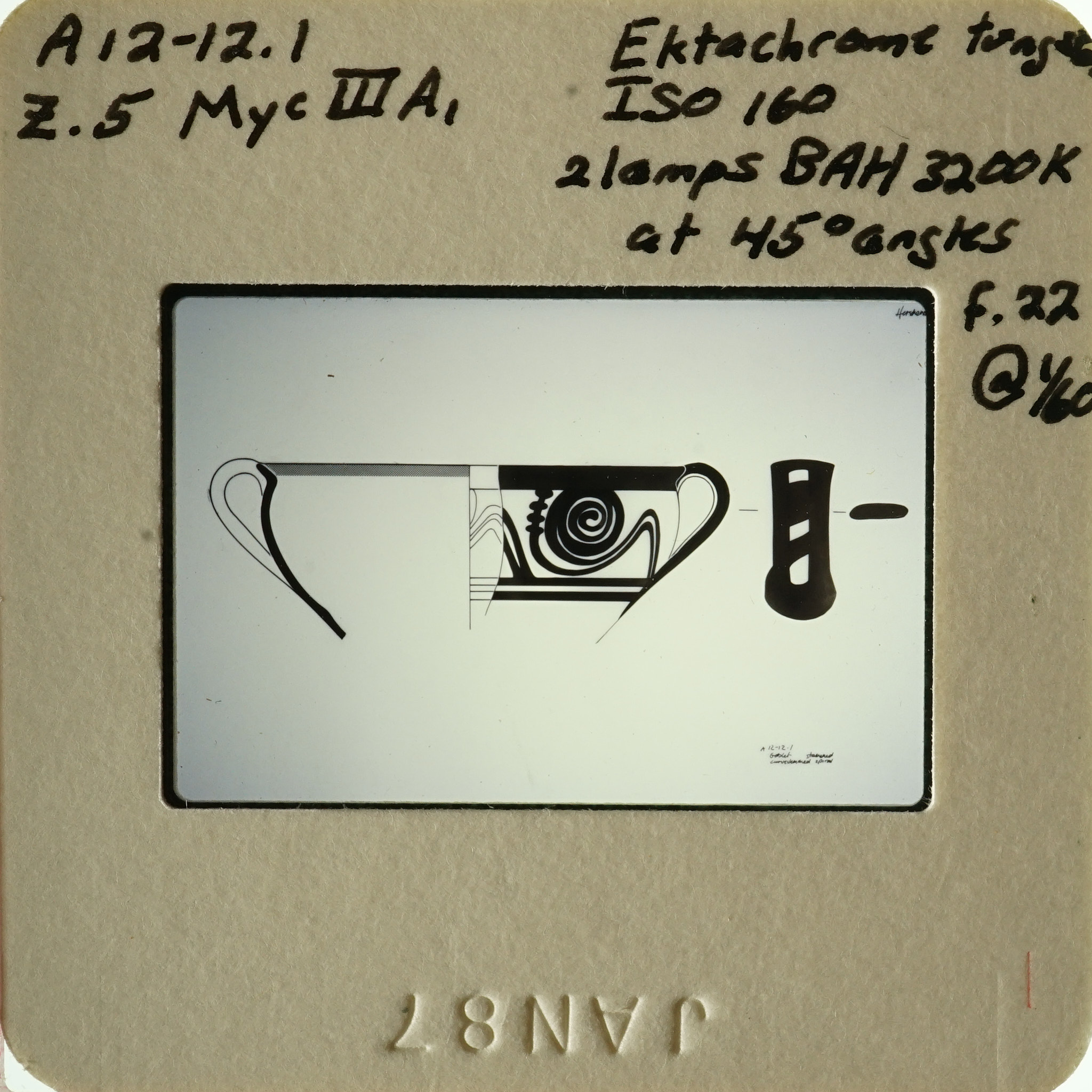 - Frame inscribed: A12-12.1 z.5 Myc IIIA, Ektachrome tungsten ISO 160 2lamps BAH 3200K at 45* angles f.22 @1/60.