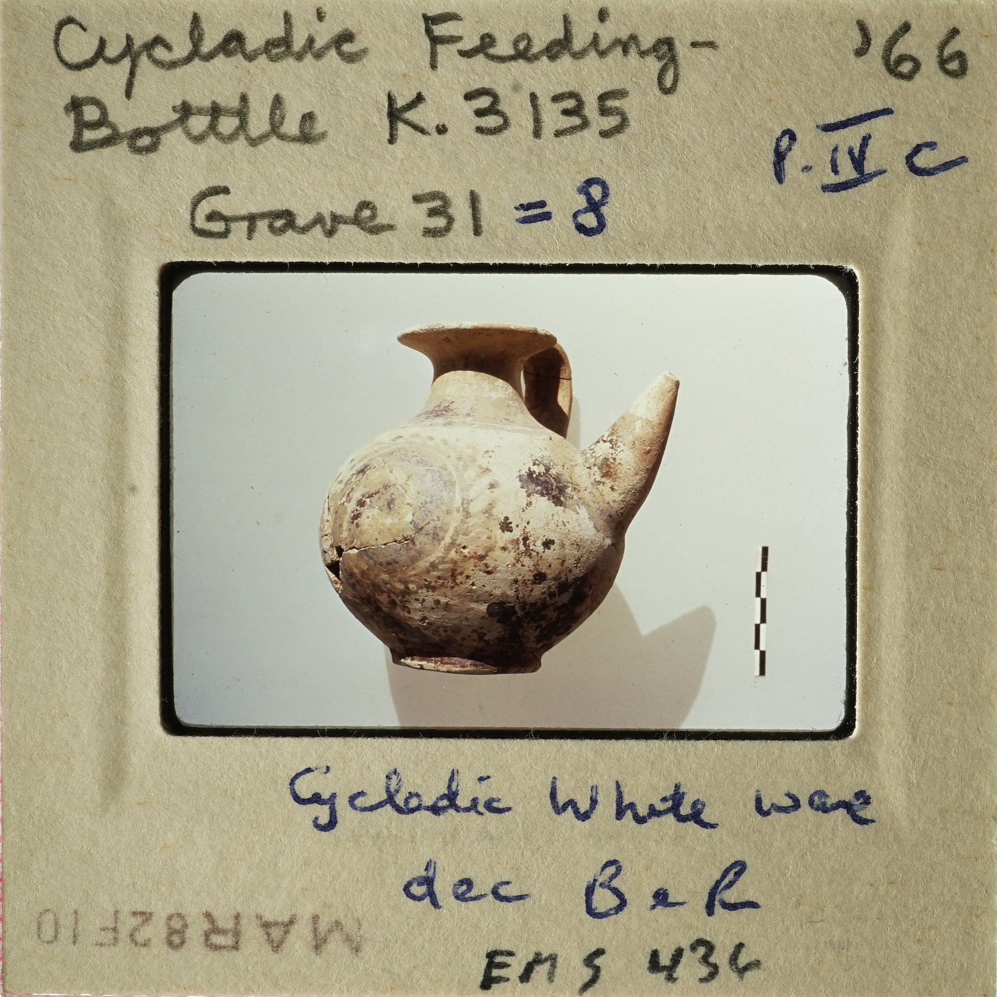 - Frame inscribed: Cycladic Feeding-Bottle K.3135 Grave 31 = 8 '66 P.IVc Cycladic white ware dec B + R EMS 436.