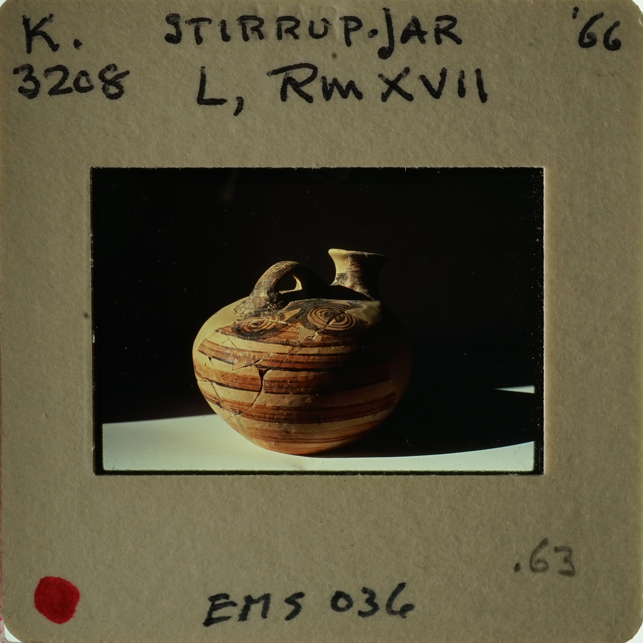 - Frame inscribed: K.3208 Stirrup-Jar '66 L, Rm XVII EMS 036 .63.
