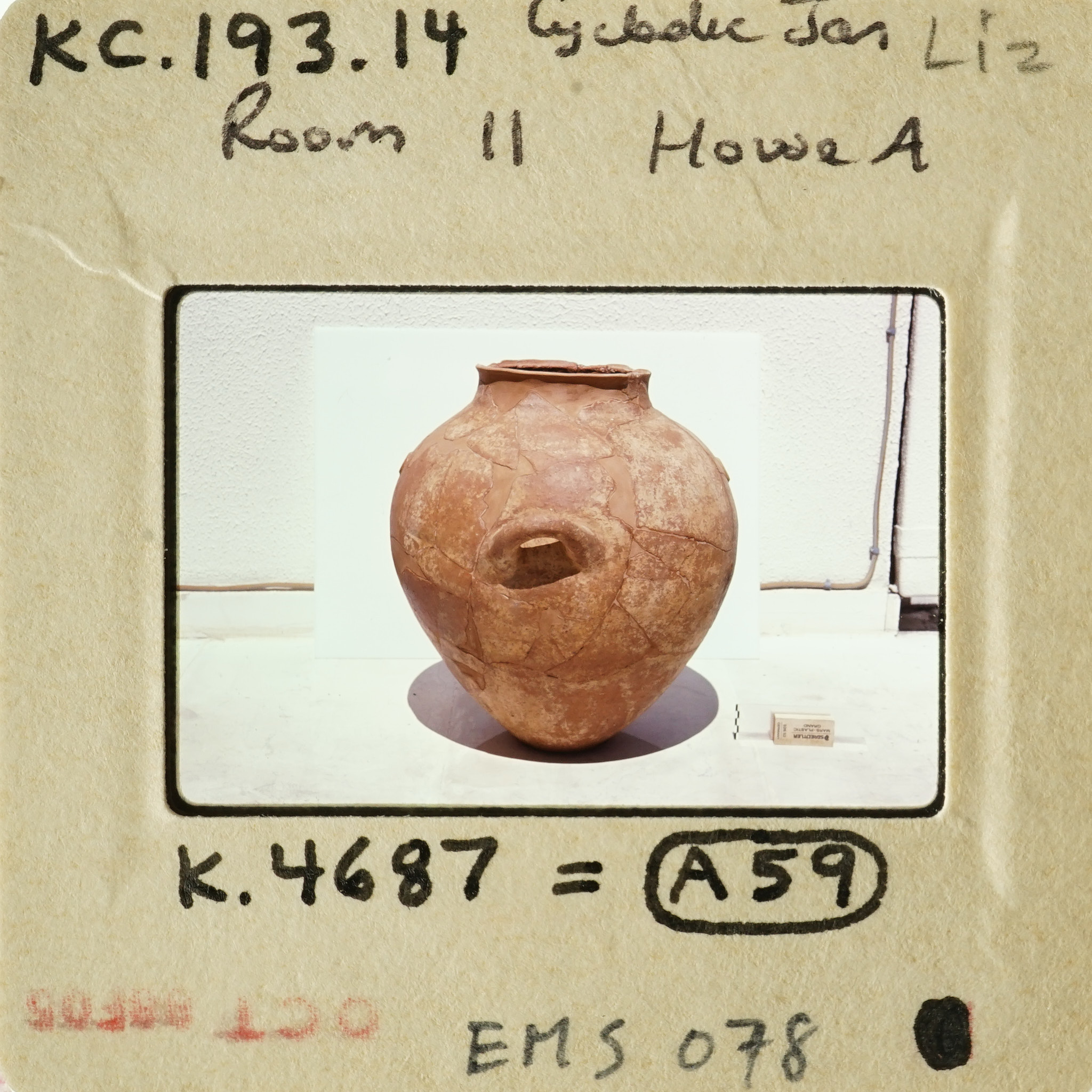 - Frame inscribed: KC.193.12 Cycladic Jar Liz House A Room II K.4687 = (A59) EMS 078.