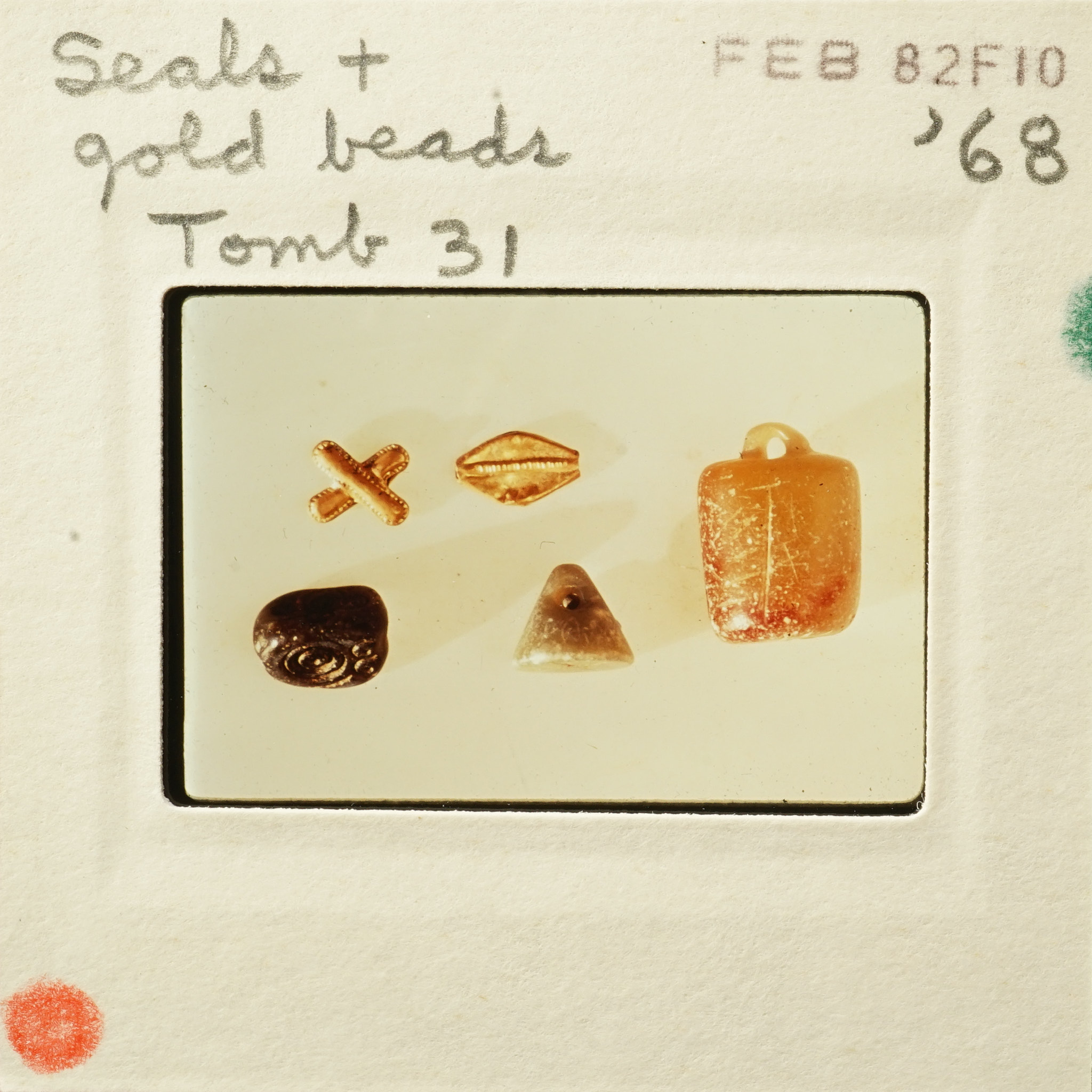 - Frame inscribed: Seals and gold beads, Tomb 31 '68.