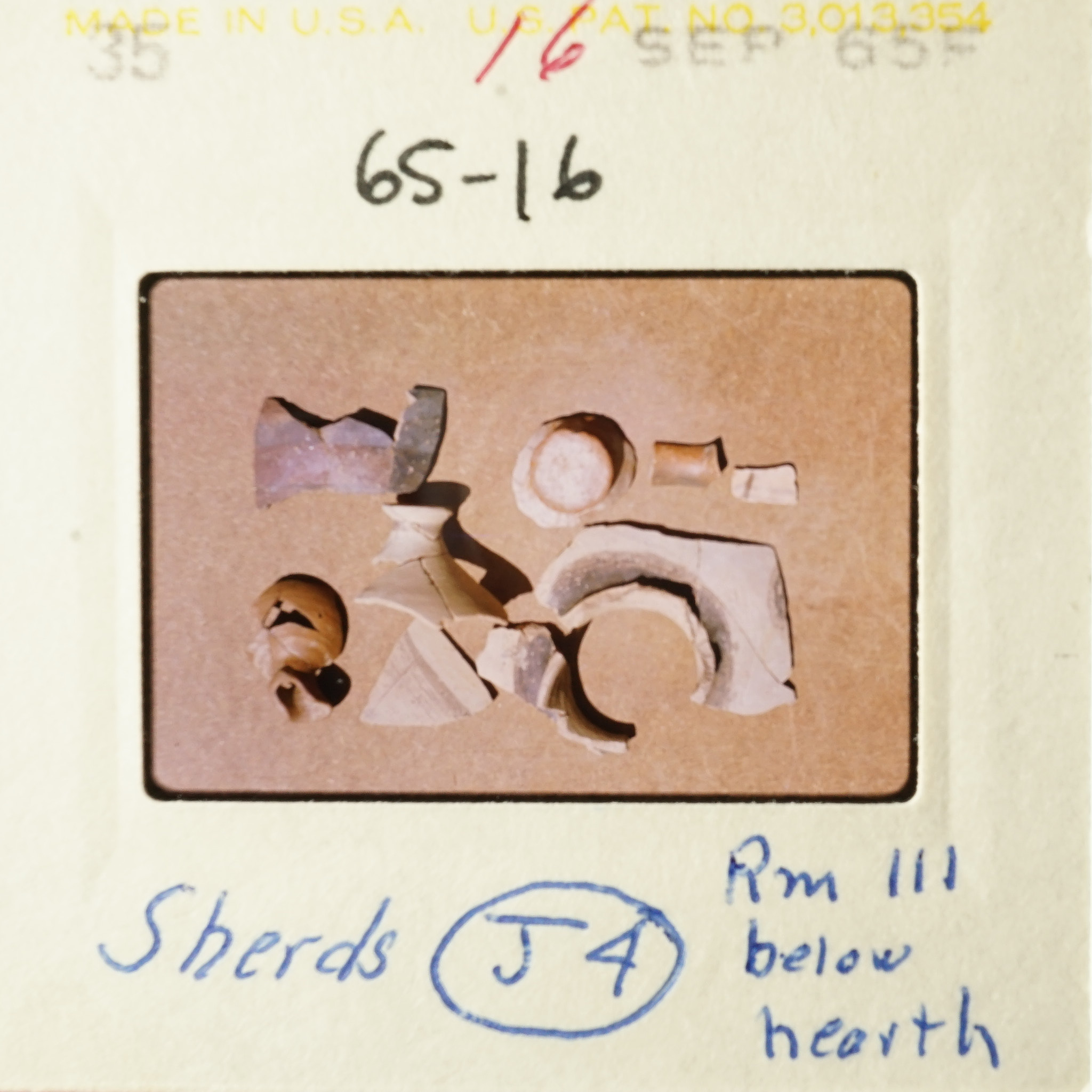 - Frame inscribed: Sherds J4 Rm III below hearth 65-16.