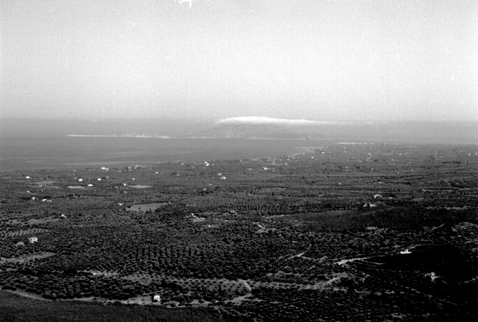 Unedited/Preliminary Label From peak and Church of Profitis Ilais (Lefki) to NW: Vromoneri to Gargaliani coastal plain, Island of Proti in distance (with clouds).