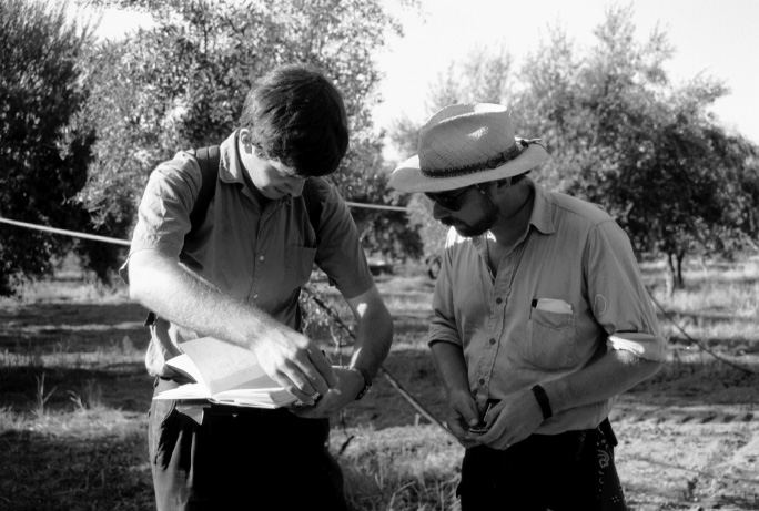 Unedited/Preliminary Label G team (5/8/93) working above and to the E of Mati: Close-up Charles Watkinson (TM#36) and John Bennet (TM#4) confering over notebook and map