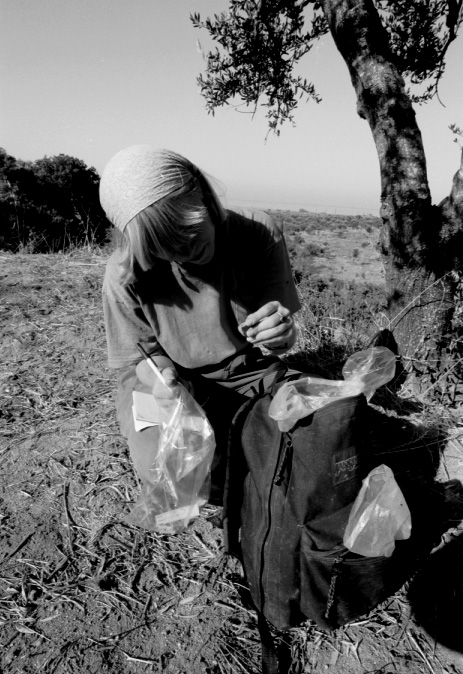 Unedited/Preliminary Label G team (5/8/93) working above and to the E of Mati: Close-up of Susan Lupack (TM#58) bagging artifacts