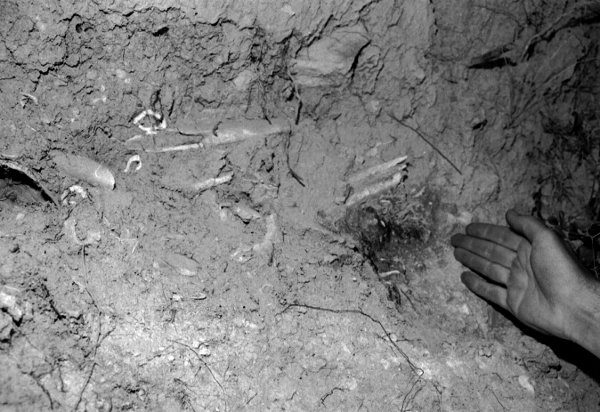 Unedited/Preliminary Label Site I19, Tsouka: views of grave #1 with bones in scarp, John Bennet's (TM#4) hand for scale. Also see film# 036.22 to 036.28