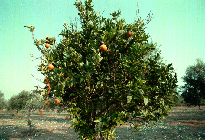 Unedited/Preliminary Label D team working in area E of Marathopolis 6/8/93: close-up of orange tree with flagging tape