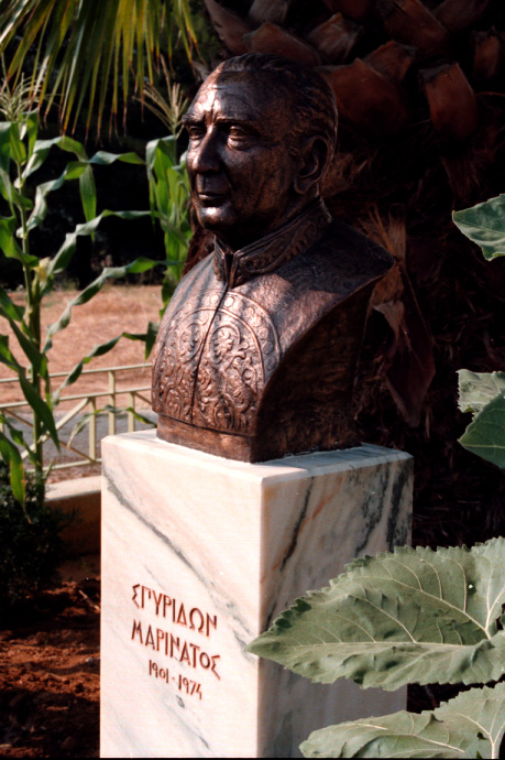 Unedited/Preliminary Label Bust of Marinatos in from of Hora Museum (close-up)