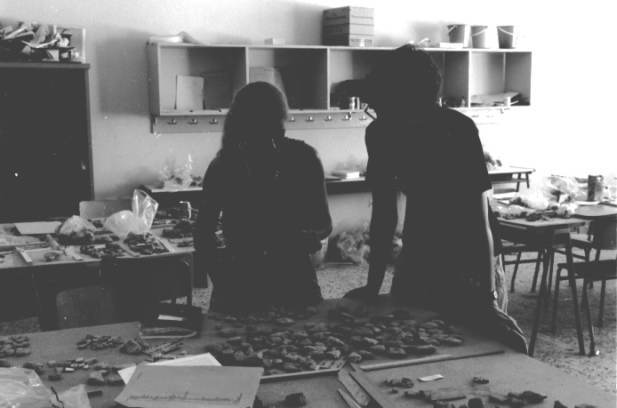 Unedited/Preliminary Label Hora School House 6/8/93: Shari Stocker (TM#33), Ann Harrison (TM#52) processing pottery