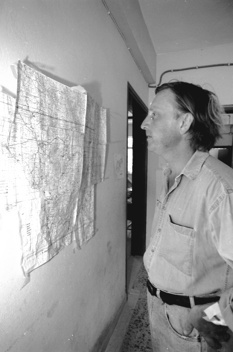 Unedited/Preliminary Label Hora School House 6/8/93: A wounded Jack Davis (TM#10) looking at map of area on wall