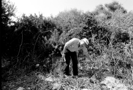 Unedited/Preliminary Label Site G01, Dialiskari: hexagonal brick structure (wider view) - John Bennet (TM#4) pointing to brickwork
