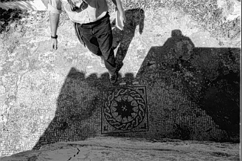Unedited/Preliminary Label Site G01, Dialiskari: view of center section of mosaic from house porch (John Bennet's TM#4 legs in picture)