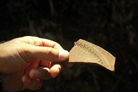 Unedited/Preliminary Label Site G01, Dialiskari: close-up of fragment of African Red Slip rouletted plate found in wall ca. 30m N of hypocaust (picked up the following year: G94-9011031GR-02).