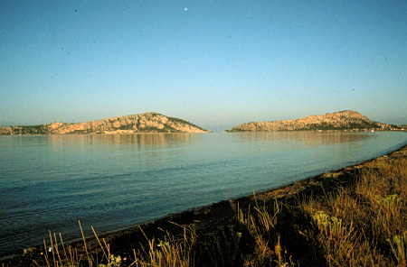 Unedited/Preliminary Label View to W from point on Divari (spit of land separating Navarino Bay and Lagoon) showing Sphakteria and Palaiokastro