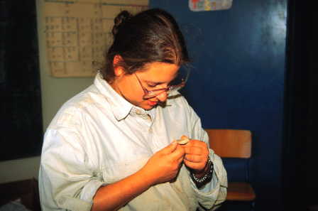 Unedited/Preliminary Label In and around Hora School house: close-up of Laura DeLozier (TM#46) looking a pot sherd