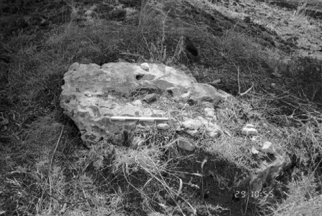 Unedited/Preliminary Label Site K04, Koutsouveri: stone cover slab? with dense tile scatter and mound (possible tomb) from NW (close-up)