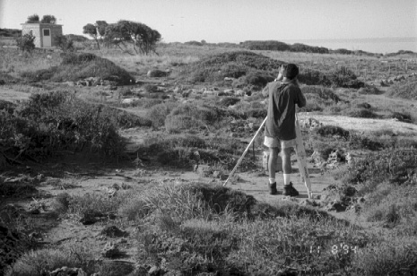 Unedited/Preliminary Label Site I28, Vergina Rema: Paleolithic site. Dave Stone, TM#67, total station instrument and flagged artifacts. Looking S.